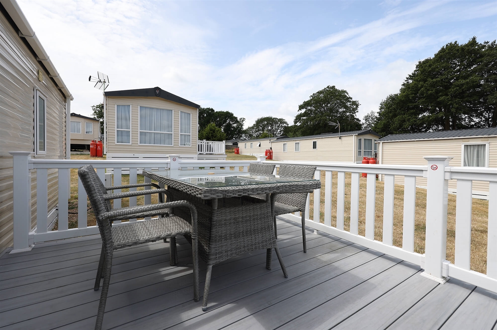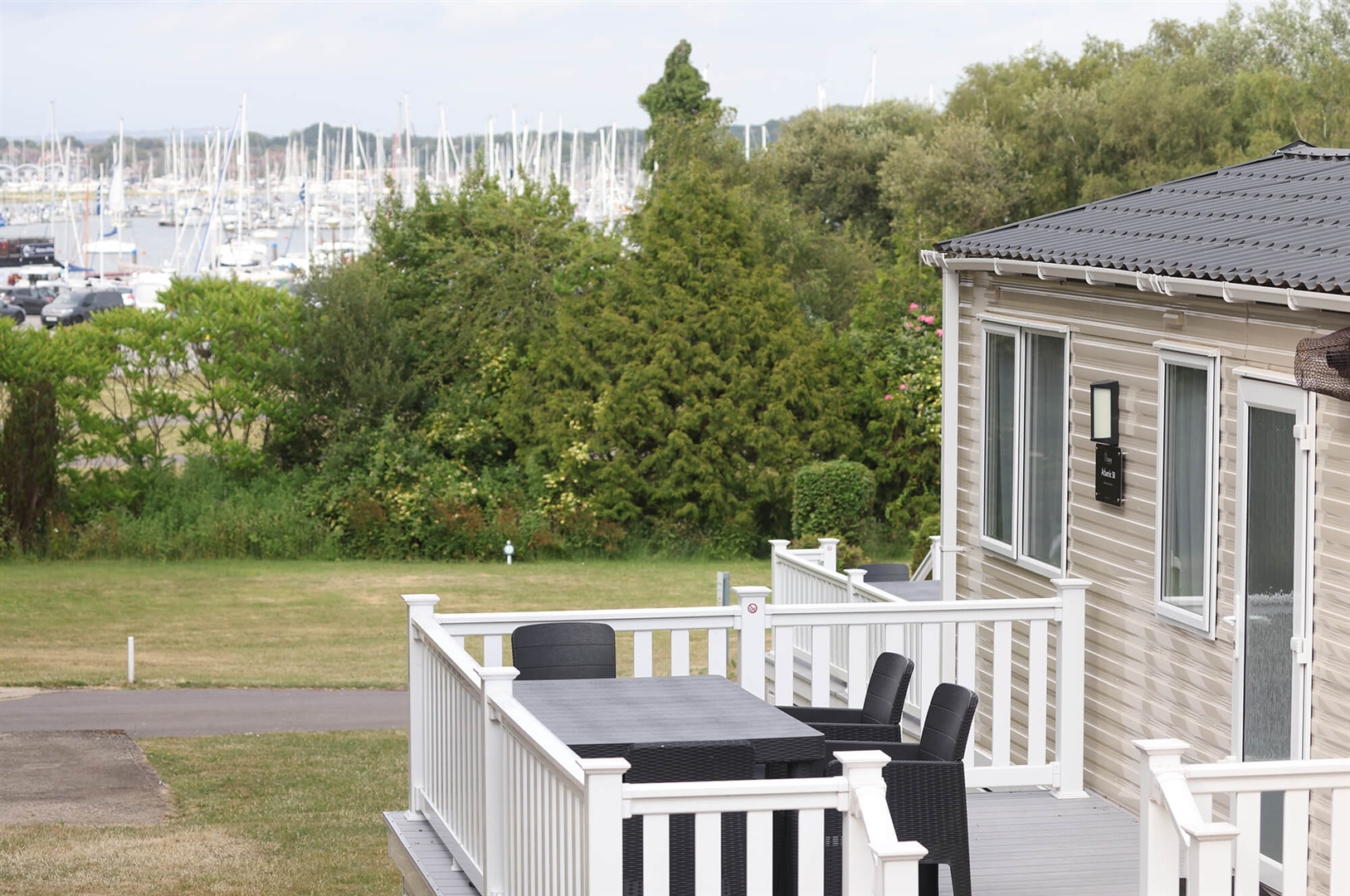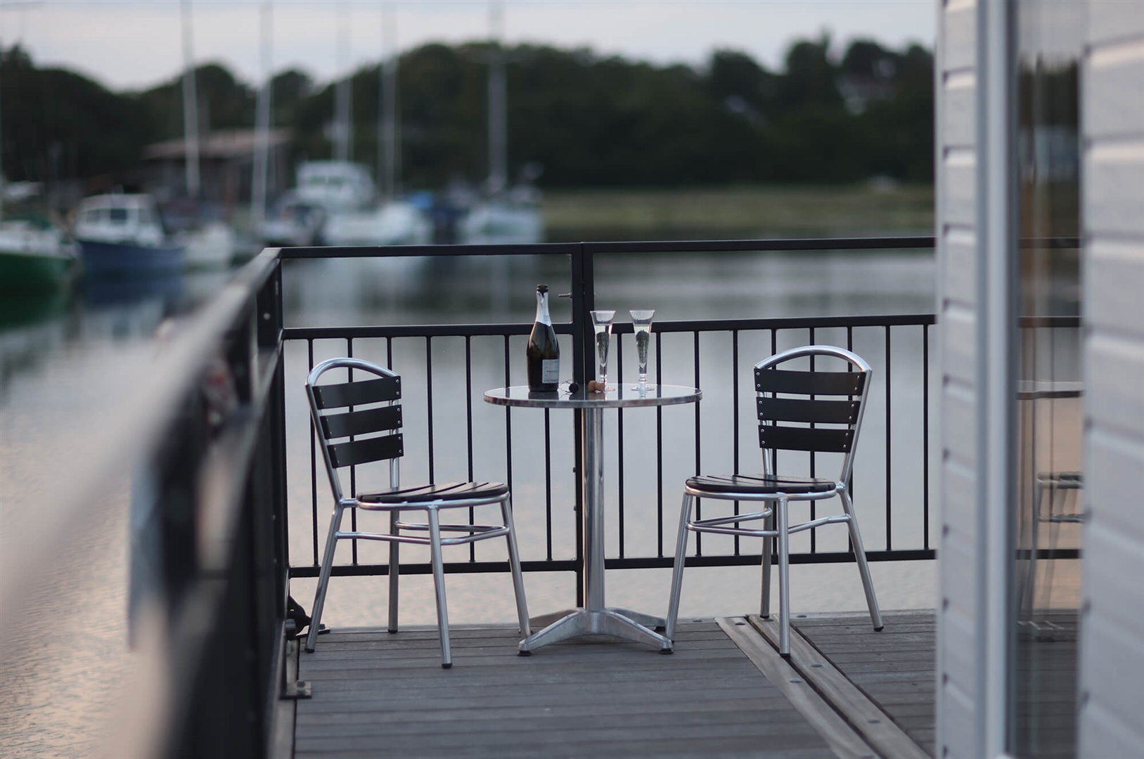 The marine decking is furnished with a table and chairs to enjoy the waterside views looking up the River Hamble.