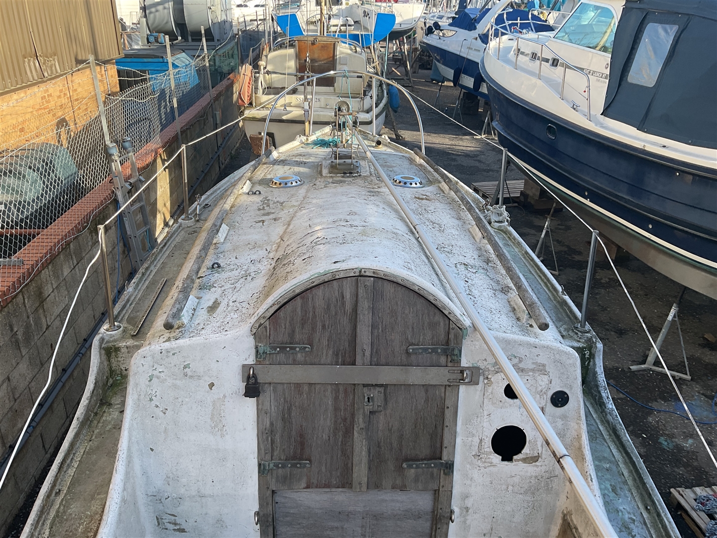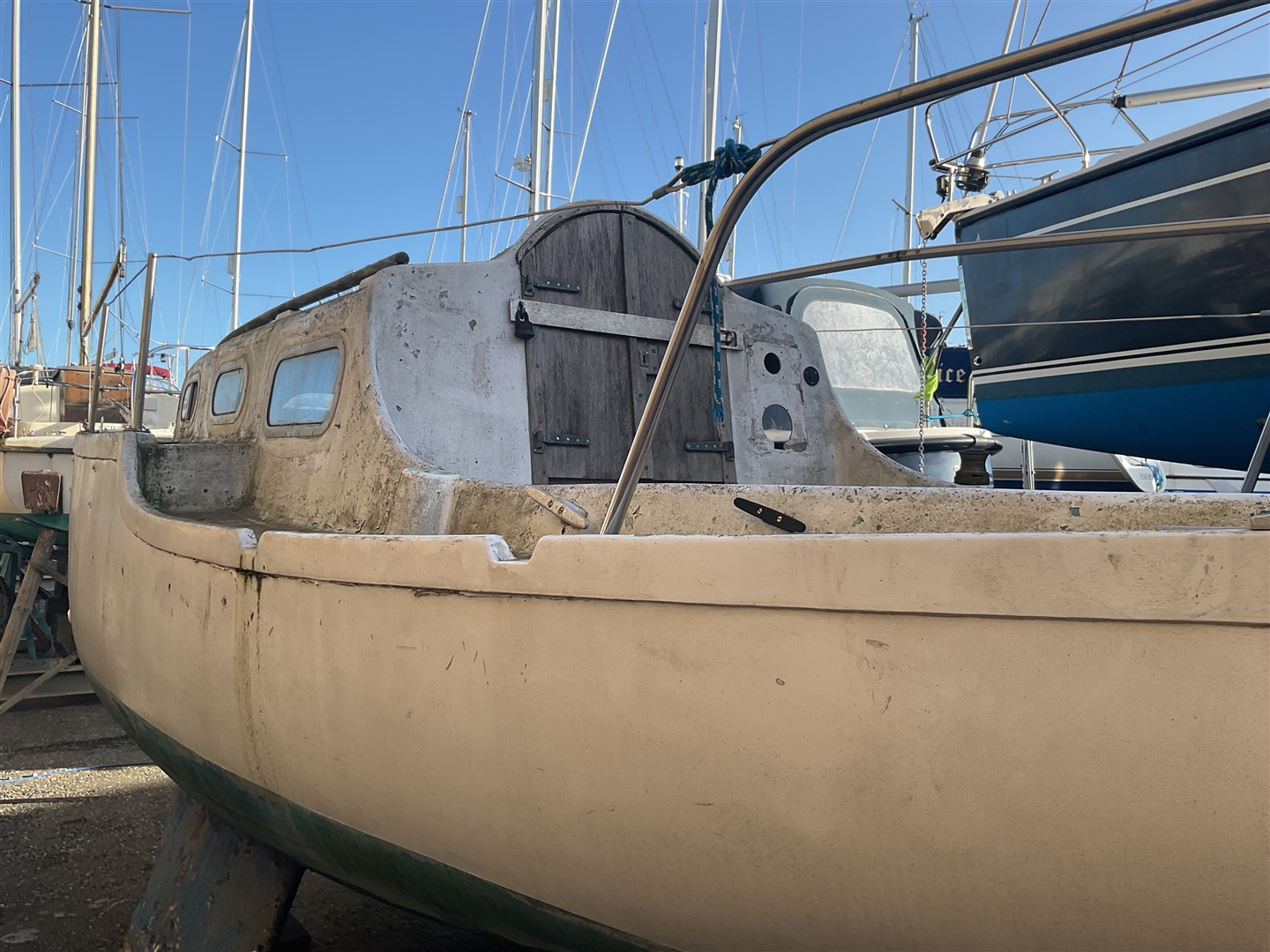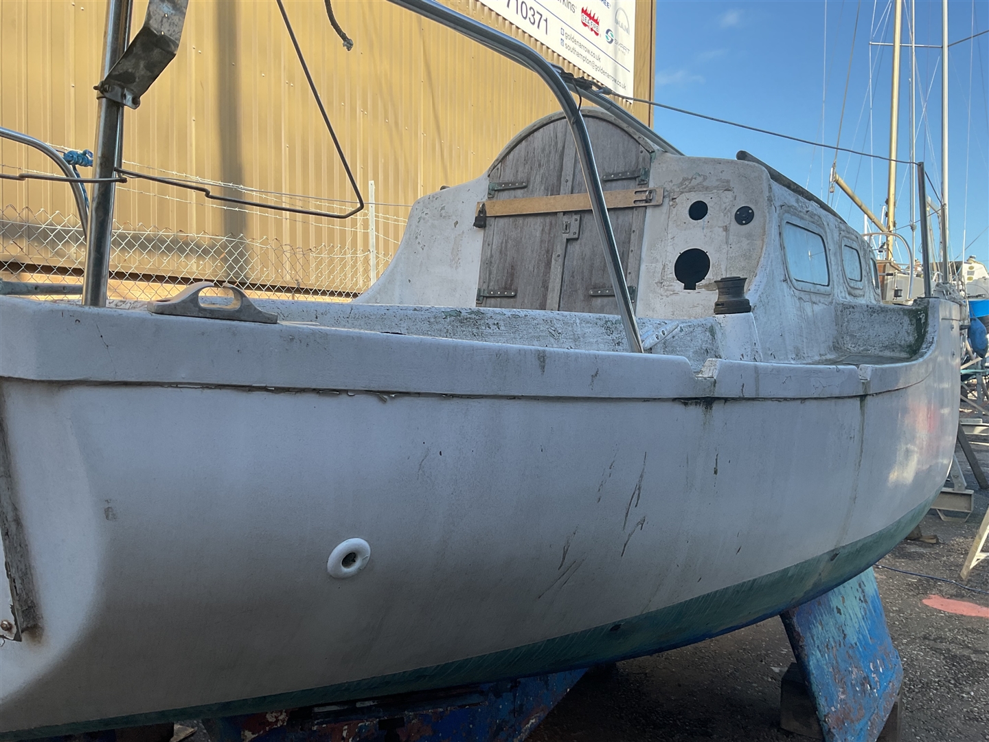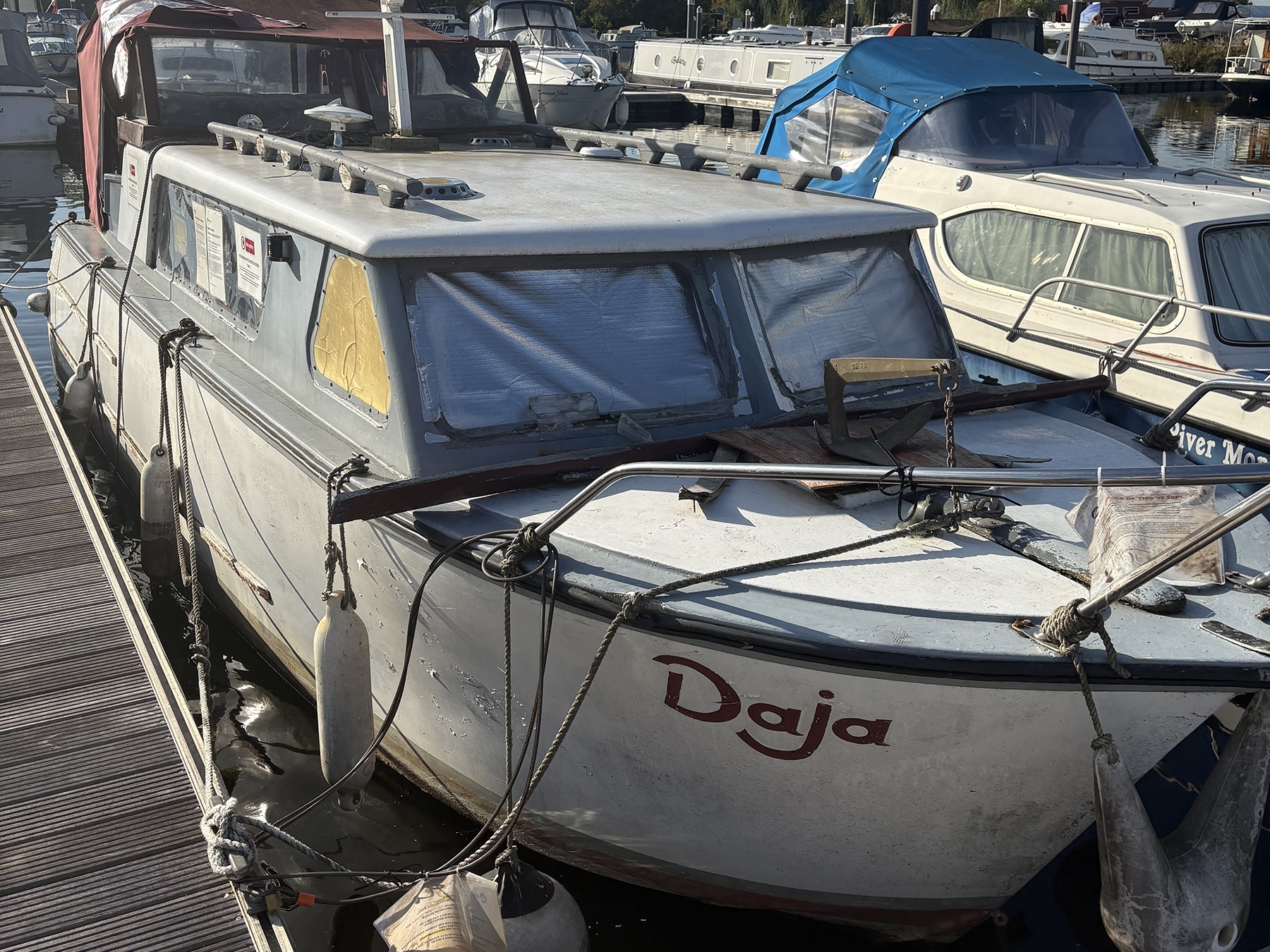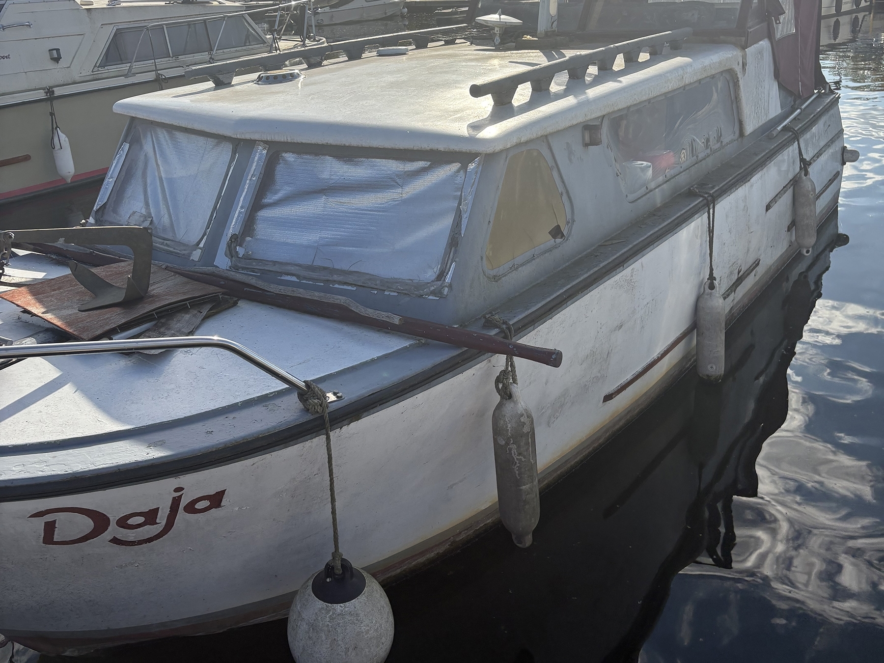 Daja is a 1970 Freeman 22, measuring 7.9 metres in length. She is currently afloat and fitted with a 15hp Honda outboard engine, which is not in working order. The interior is in poor condition, and the exterior requires a fair amount of attention. The winning bidder must remove Daja once the sale has been completed, it cannot be worked on in the marina and is sold as seen with no warranty.