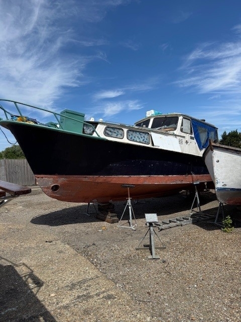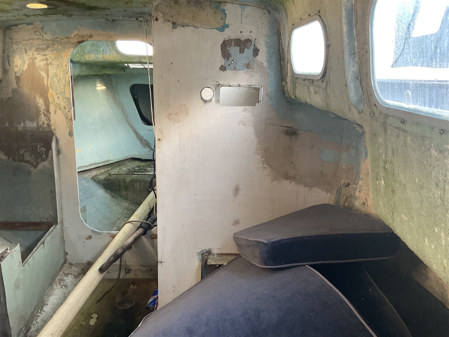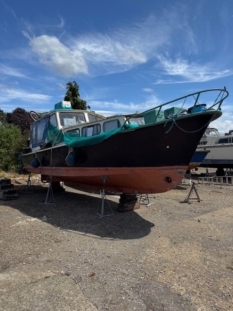 Serenity is thought to be an early 1970s Dutch steel motor cruiser, although her exact age is unknown. She is powered by an inboard diesel engine, which is currently not operational. The vessel is in need of a complete refurbishment, including a full interior strip-out. No trailer is included in the sale. The boat is ashore on hard standing at Penton Hook Marina, where lifting can be arranged through Penton Craning at the buyer’s expense.