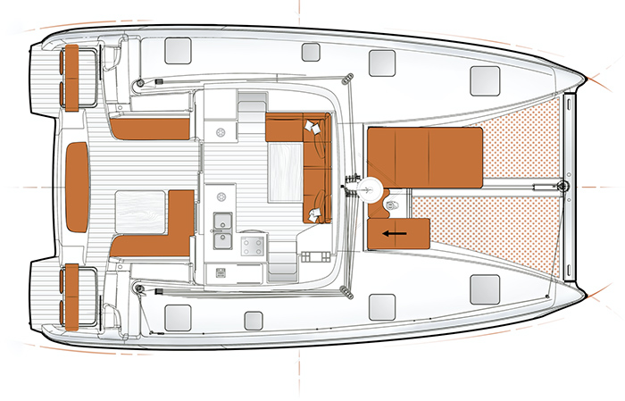 Excess 11 has benefited from the experience of her elders, without sacrificing all the comfort attributes needed for enjoyable cruising. Add to this a volume worthy of a larger boat, whether in the saloon or in the cabins, with for example a 2 by 2-meter (6½’ x 6½’) bed in the owner's cabin or bathrooms with separate showers! On deck, she offers the comfort and friendliness of a large open cockpit and twin helm stations, offering both real steering sensations and direct contact with the rest of the crew.