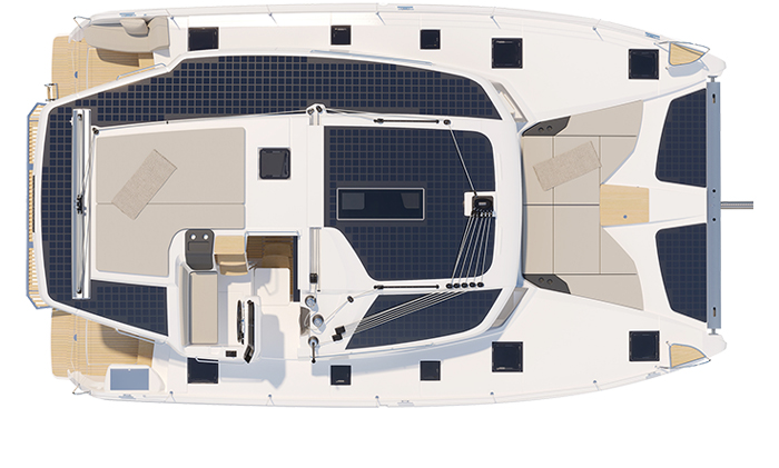 At 41 feet, this catamaran redefines compact elegance, with stretched horizontal lines that create a refined, modern aesthetic. Well-canvassed for long passages yet agile near the shore, it remains easy and enjoyable to handle. The deck layout features a popular double helm and manoeuvring station, with a dedicated pod for instruments. Meanwhile, the crew can enjoy new relaxation areas, including sun loungers on the bimini and forward coachroof, as well as an innovative lounger integrated into the port transom.