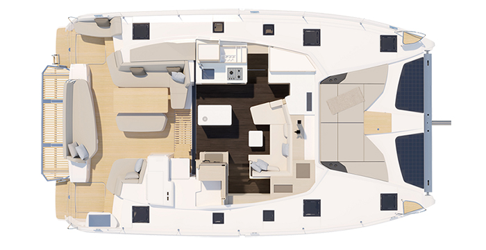 At 41 feet, this catamaran redefines compact elegance, with stretched horizontal lines that create a refined, modern aesthetic. Well-canvassed for long passages yet agile near the shore, it remains easy and enjoyable to handle. The deck layout features a popular double helm and manoeuvring station, with a dedicated pod for instruments. Meanwhile, the crew can enjoy new relaxation areas, including sun loungers on the bimini and forward coachroof, as well as an innovative lounger integrated into the port transom.