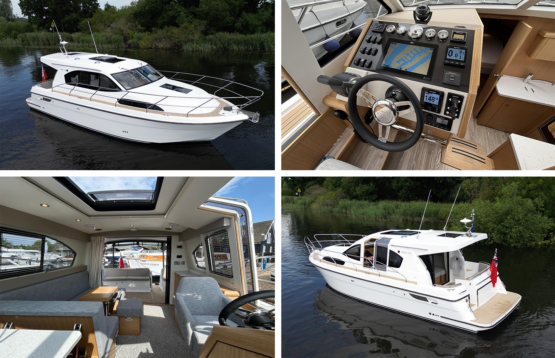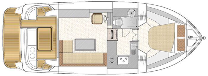 Like all Sedan style Haines models, the 32 Offshore benefits from the fully opening ‘slide and stack’ aft saloon doors giving a panoramic view in all weathers. In this layout, the accommodation comprises a forward cabin with island double, well equipped galley, shower/toilet, and a light airy saloon opening onto the aft deck.