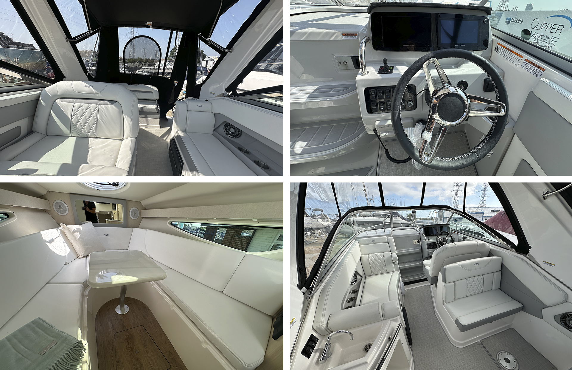 Thanks to comfortable wraparound seating and large windows that let in an abundance of light you might forget that you are in the salon. The 28 Express's cockpit layout features forward-facing aft-facing and multi-position seating for versatility and thoughtfully designed ergonomics. Featuring dual Garmin 9" displays and a standard bow thruster, your helm is equipped to offer enhanced performance no matter what your day brings.