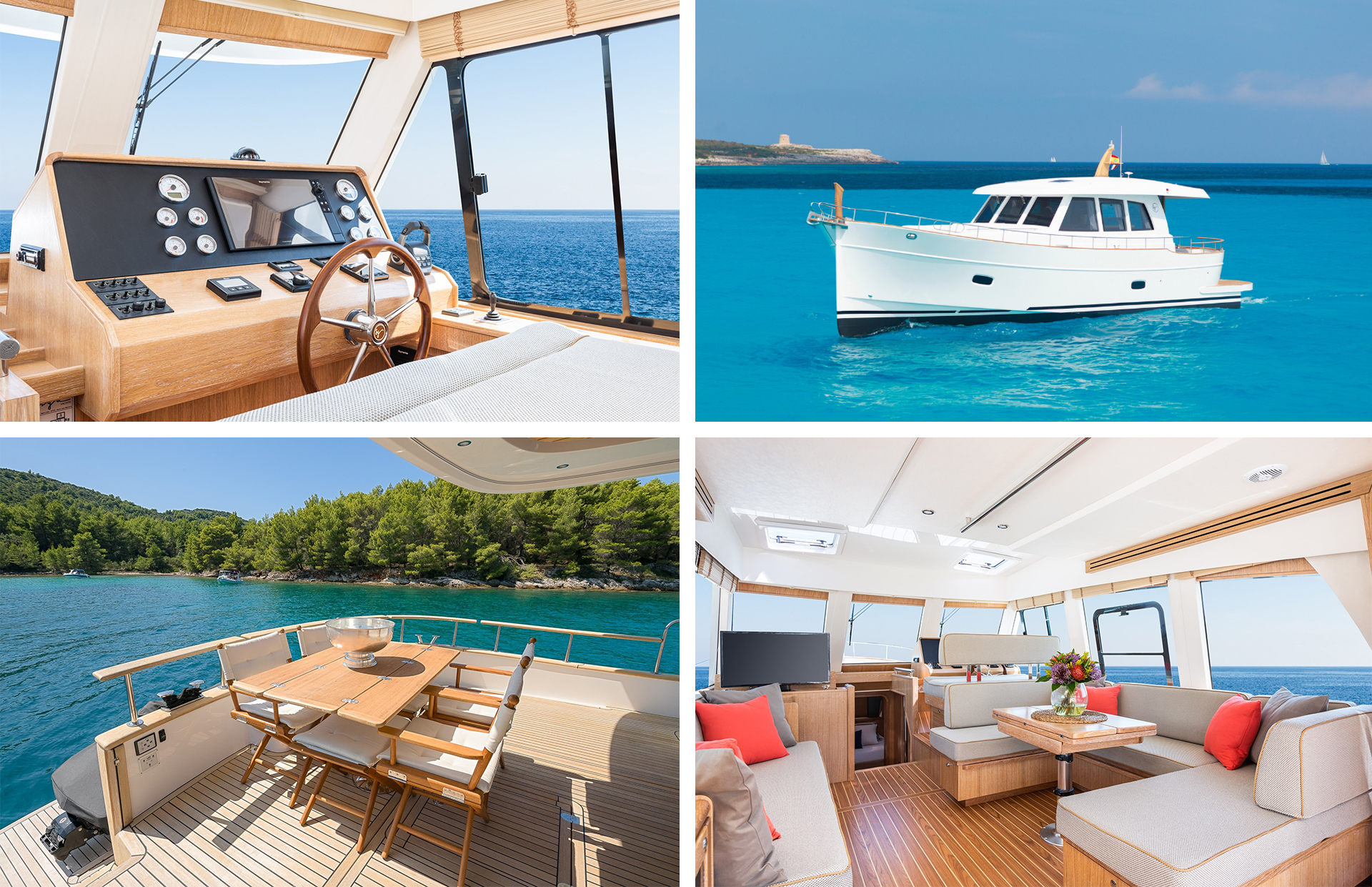 Inside, the Menorquín 55 HT is designed around volume, comfort, and traditional craftsmanship, offering accommodation for up to six guests across three cabins. The layout typically includes a full-beam master with en suite, alongside additional double and twin cabins, supported by multiple heads and generous communal living areas. What stands out is the emphasis on usable onboard space and cruising autonomy, with large fuel and water capacities supporting extended time on the water, while the interior styling leans heavily into warm wood finishes and functional elegance. Overall, it’s a yacht aimed squarely at owners who prioritise relaxed, long-range cruising with a strong nod to heritage design, rather than outright speed or ultra-modern aesthetics.