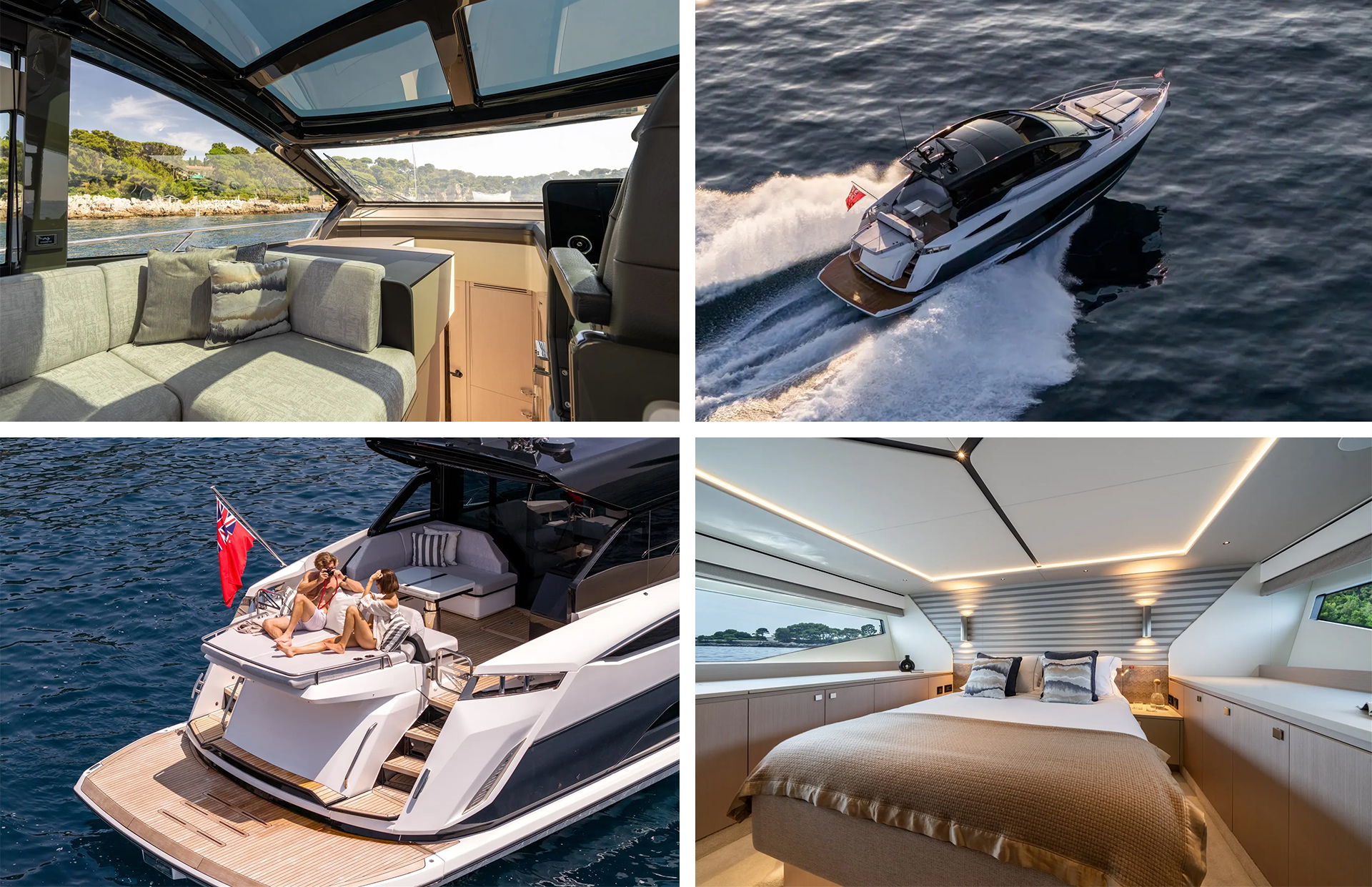 The Sunseeker Predator 55 is a striking member of Sunseeker’s iconic Predator range. Powered by twin Volvo Penta IPS-950 engines, this 55-foot yacht delivers impressive performance with top speeds reaching up to 36 knots. A defining feature of the Predator 55 is its retractable glass and carbon fibre sunroof. Measuring 2.5m x 3m, the electrically operated sunroof glides aft at the touch of a button via the helm console, opening the space to the sky above. This, combined with expansive glazing and a sweeping, double-curved single-piece windshield, creates a light-filled interior and a commanding exterior aesthetic.