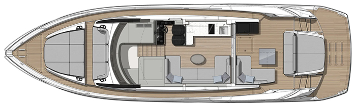 The aft cockpit seating can be repositioned to meet the fixed seating and table amidships with ample space for six and complete with an electrical sun canopy. The large sun pad over the garage features adjustable headrest bolsters and a view aft that guests will never tire of. Style and functionality work cohesively to define a yacht built for enjoyment. The angular aft fairleads form part of a stylish new rear design, integrated seamlessly into the hull with scalloped stainless steel engine vents sitting vertically outboard. With the addition of low-level LED deck lighting and a new fixed signature transom traverse, connecting port to starboard even with the bathing platform lowered, the aft profile is exquisitely proportioned without compromising functionality.